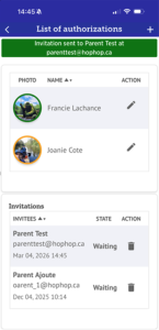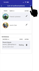 Note: In the list of authorized people, if the frame around the photo of an authorized person is green, that person has not yet logged in with their account. You can still modify information to his account (e.g. photo, last name, first name, phone number, …). If the frame of the photo is rather in orange, the person has logged into his account and you will no longer be able to make changes related to his personal information. However, at any time you can change the authorization rights or remove this person from your HopHop family group.