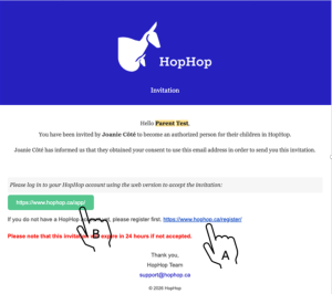 4. The invited person will receive an invitation email. If the person already has a HopHop account, they will be able to connect to their account to accept the invitation (green button, see image letter B). If the person does not have a HopHop account, they will need to create an account first in order to accept your invitation (link to create an account in the image, letter A).